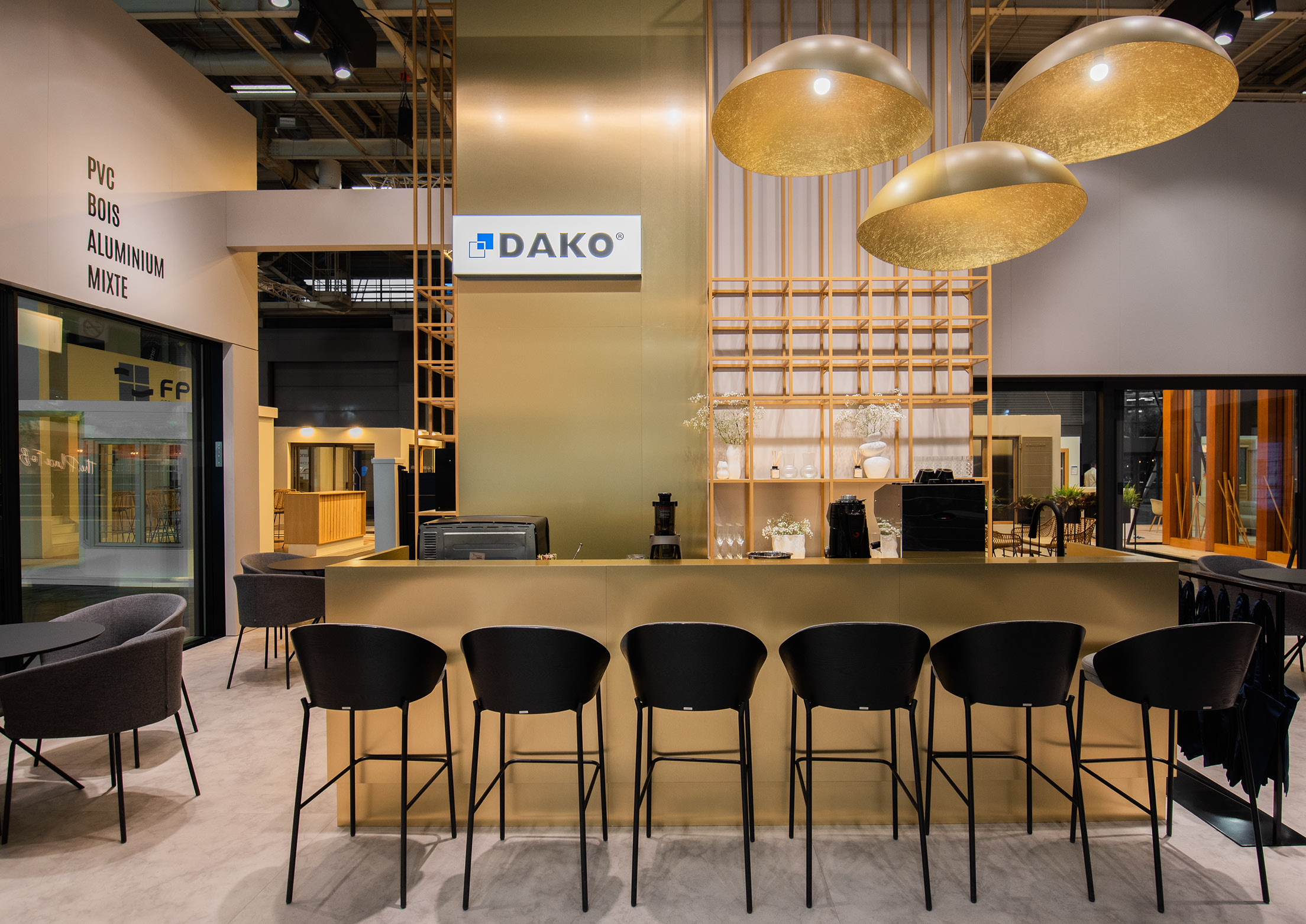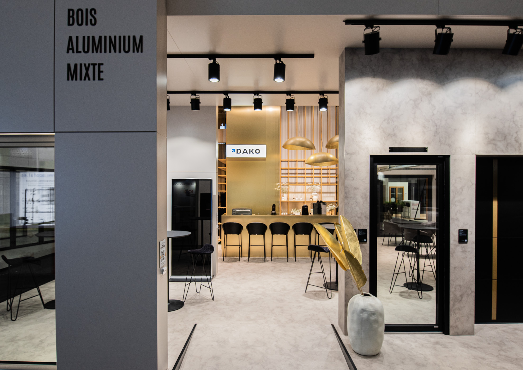 The refined material palette featured metallic finishes that caught and reflected light, adding dynamic elements to the clean, architectural forms. This thoughtful fusion of minimalism and luxury detailing transformed the functional exhibition space into an elevated brand experience.