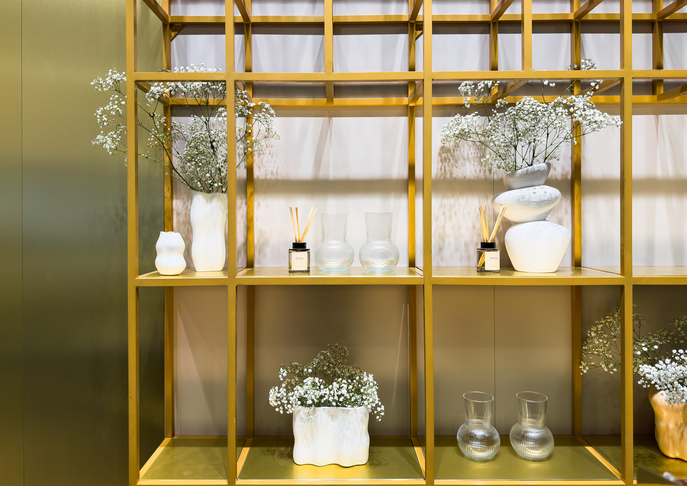 The exhibition space embodied understated luxury through a minimalist design enhanced with gold and metallic jewelry-like accents. Each element was meticulously considered, creating an environment where subtle details contributed to a sophisticated brand narrative.