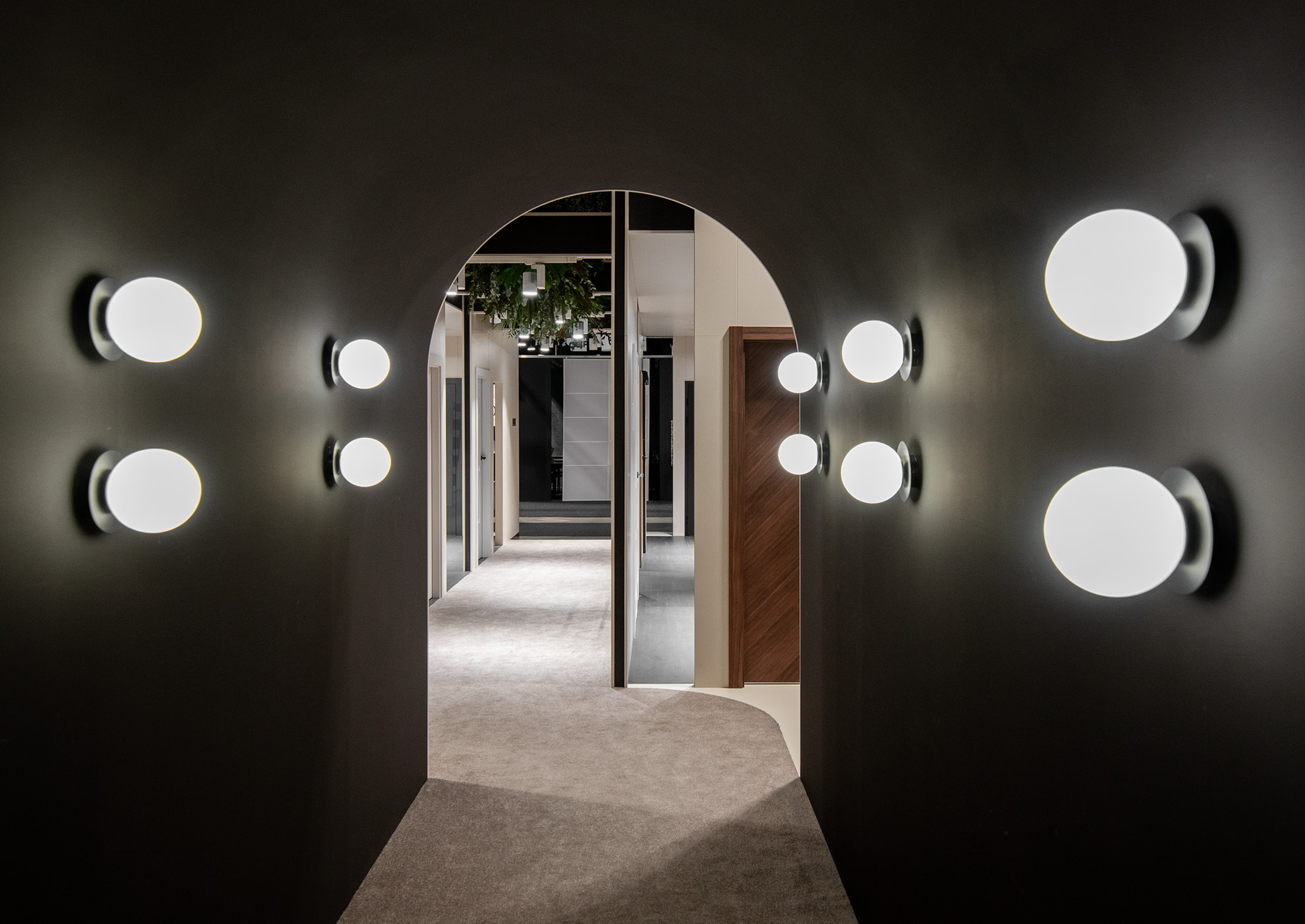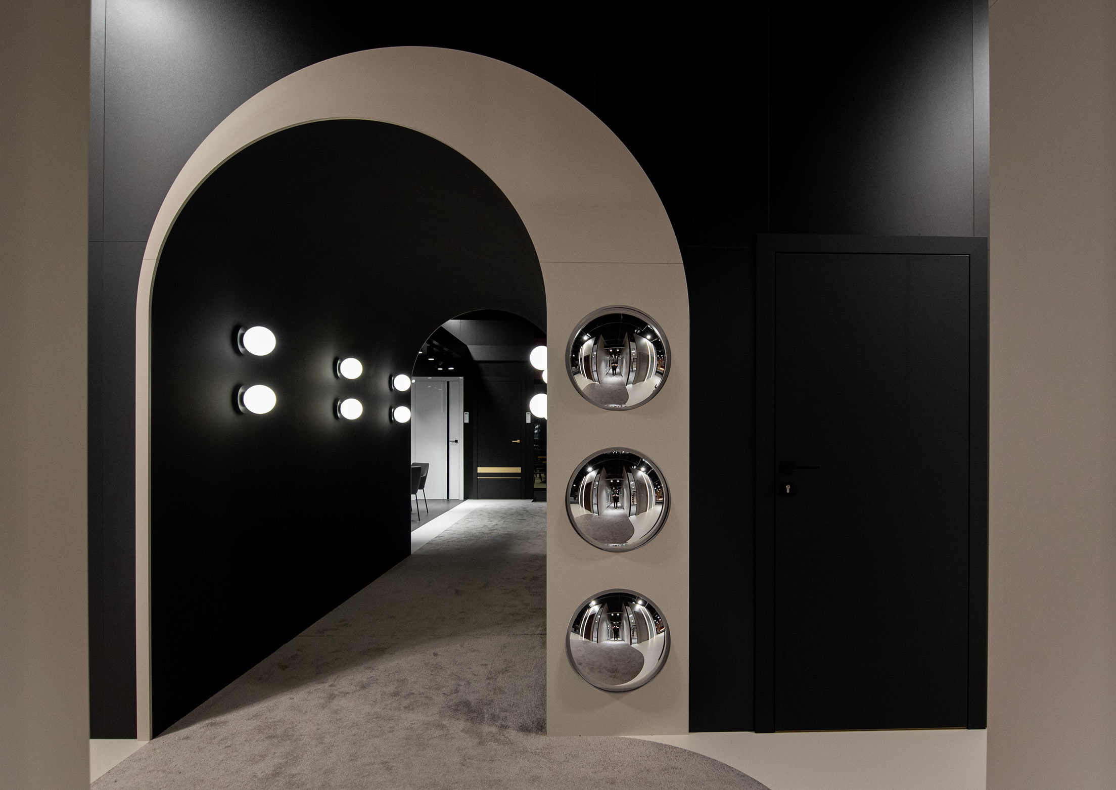 Each zone featured distinct finishes – bright white in one area and deep black in the other. The connecting portal served as both a transition space and an interesting artistic element with intriguing details. This architectural feature not only united the contrasting areas but also provided an engaging pathway that enhanced the visitor experience.