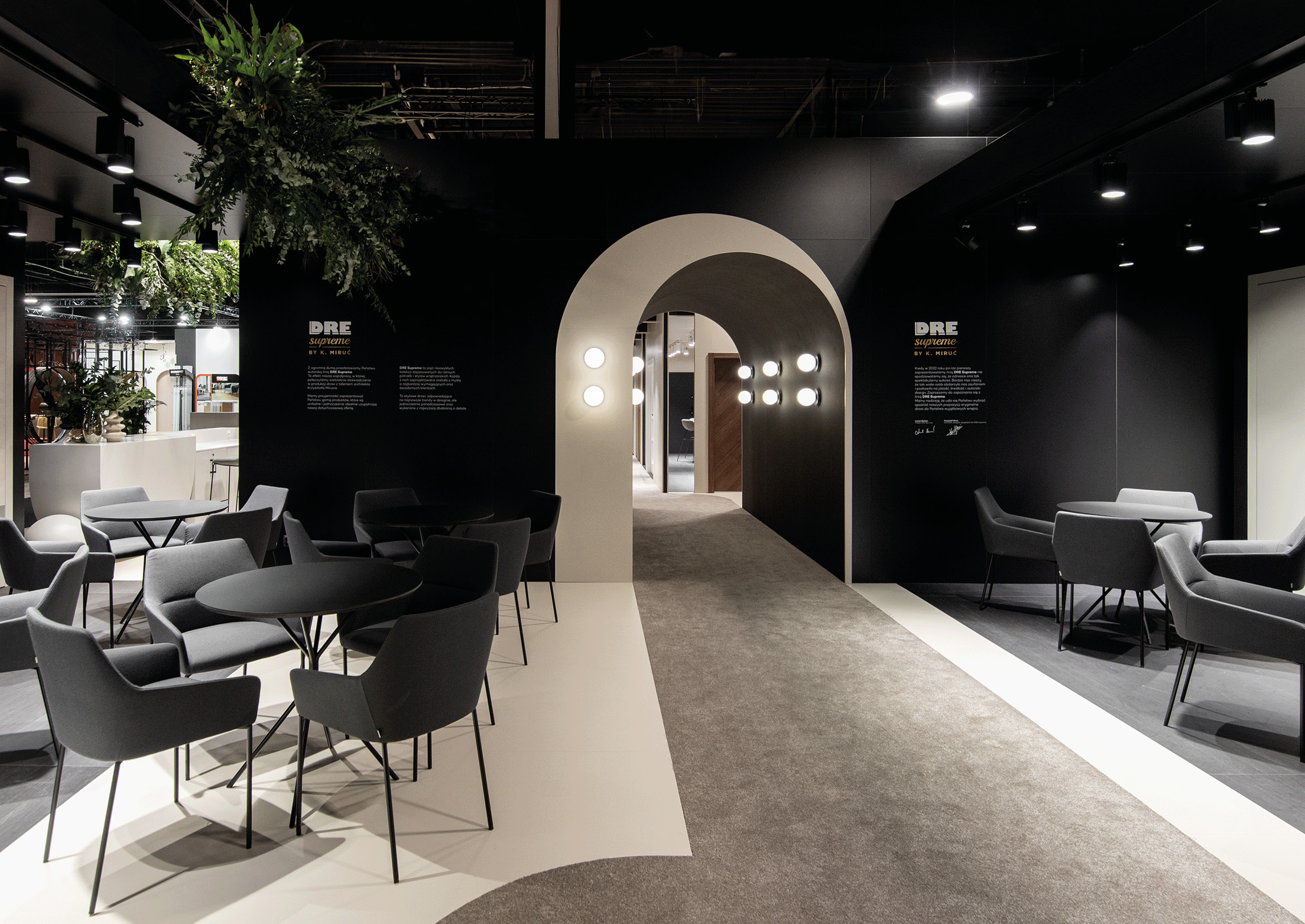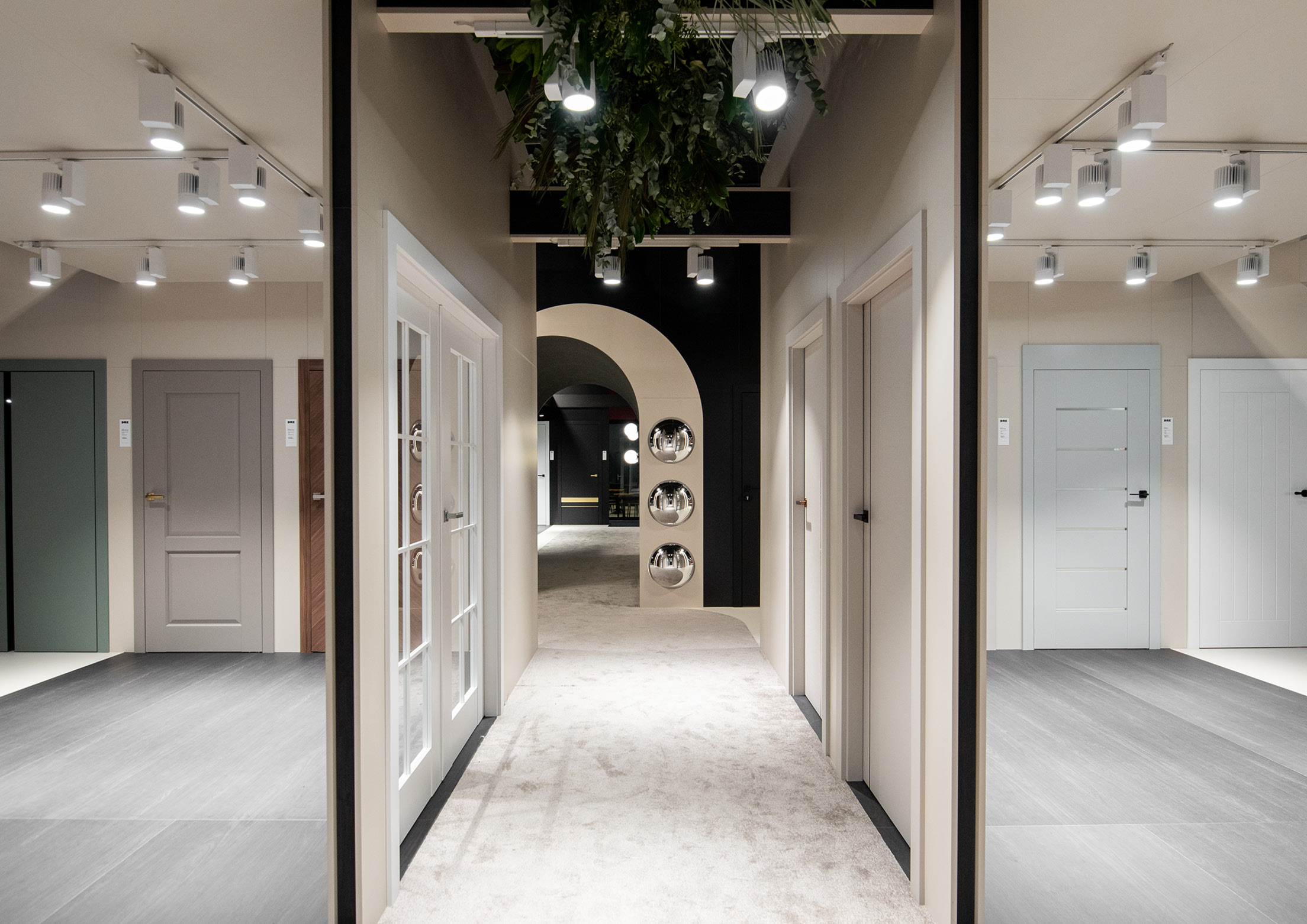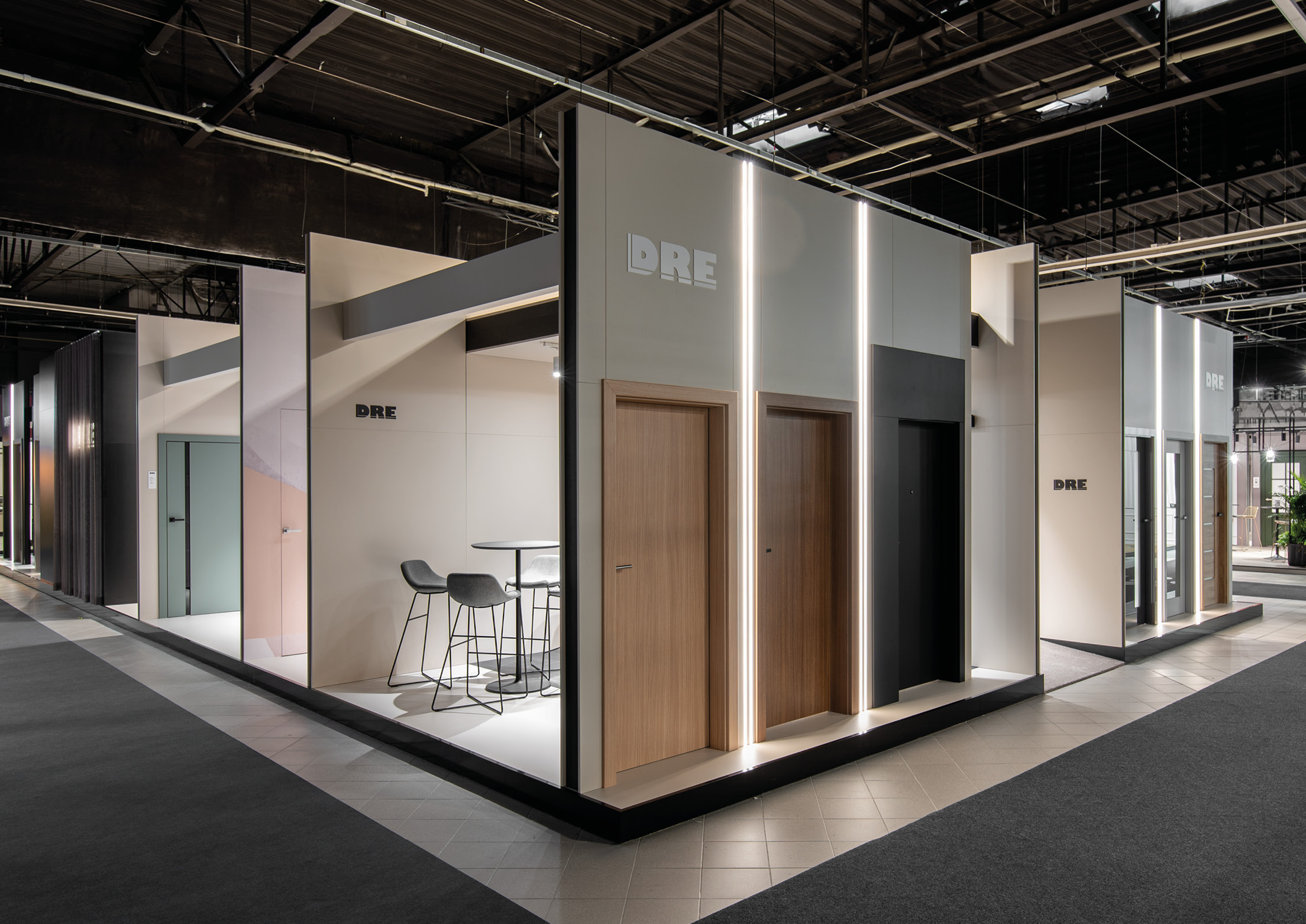 The stand was divided into two contrasting spaces – white and black – connected by an architectural portal, creating a striking space for door display. The contrast between these spaces created an ideal backdrop for showcasing the diverse door collection.