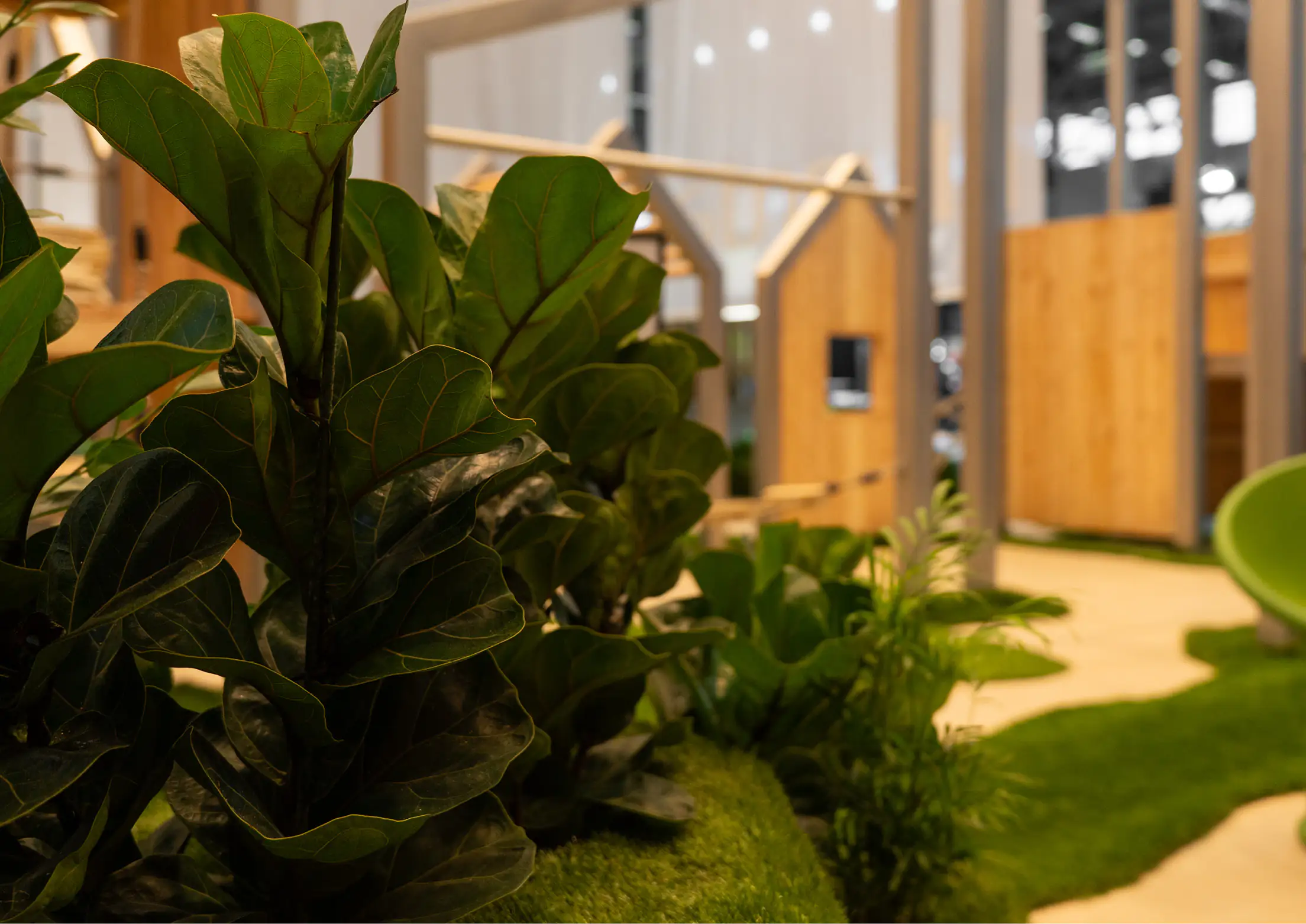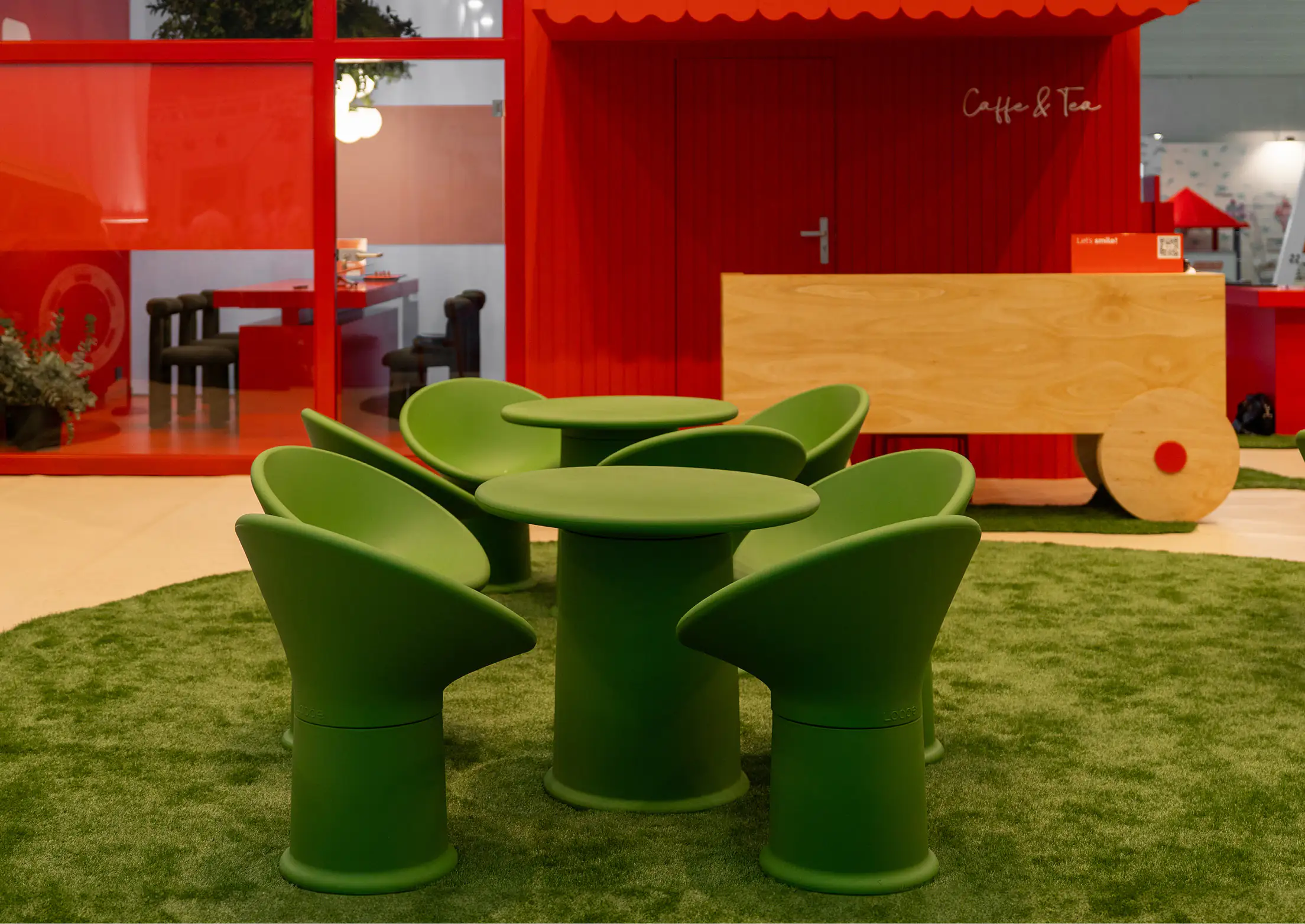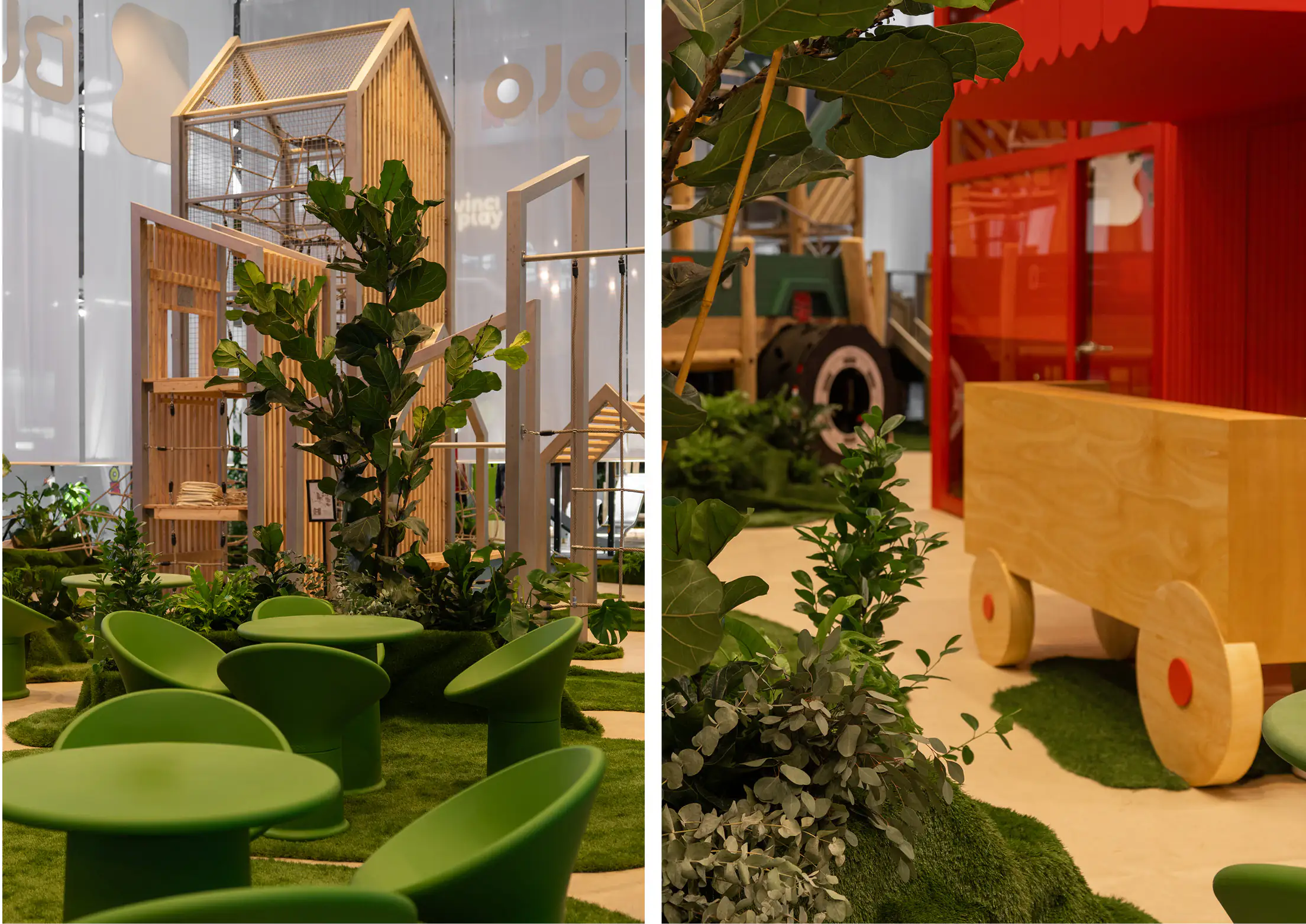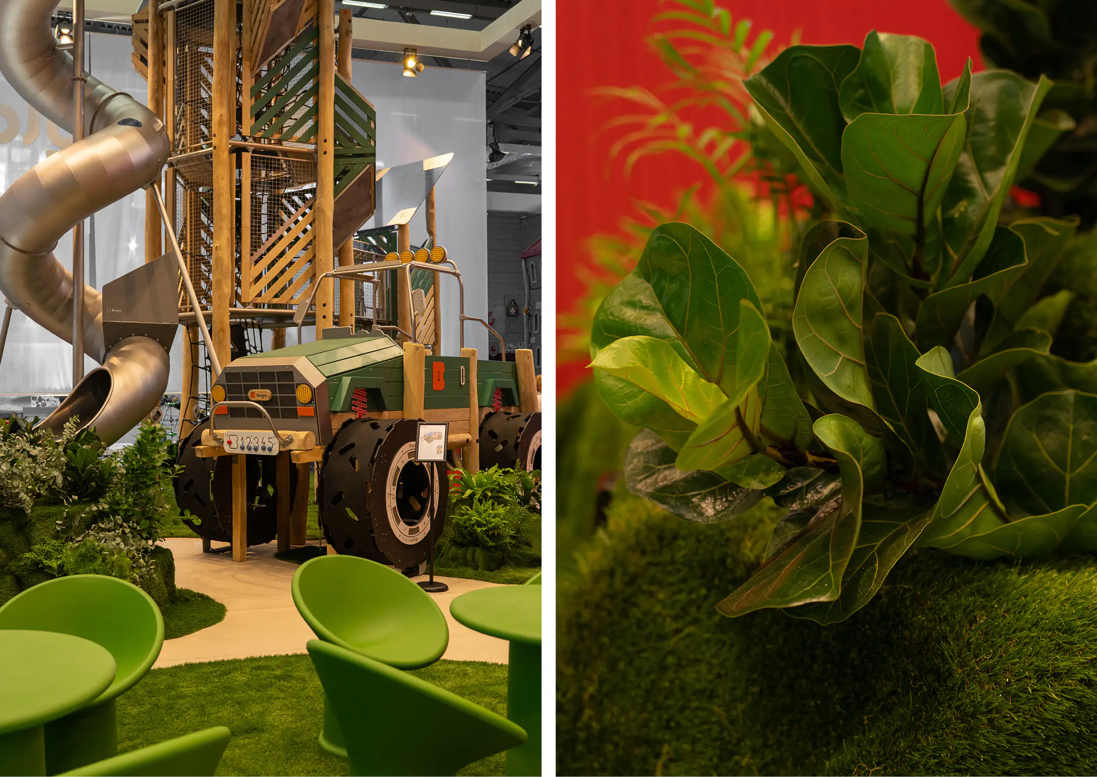 Wyrazista czerwień domku o prostej formie jak z dziecięcego rysunku stanowiła mocny akcent przyciągający uwagę. Drewno konstrukcji i zieleń wykładzin dodają naturalności. A wszystko to w otoczeniu małej dżungli składającej się ze 150 pachnących roślin, które stworzyły małą oazę.