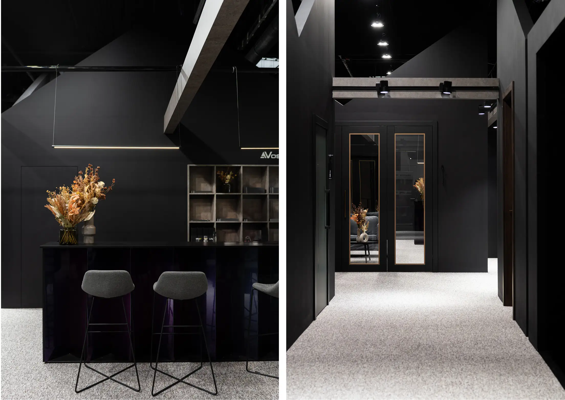 To stoisko powstało w oparciu o ideę architektury modułowej, inspirowanej logiką domów modułowych. Każdy moduł miał jasno określoną funkcję, dzięki czemu odwiedzający poruszali się po przestrzeni intuicyjnie i naturalnie odkrywali kolekcje drzwi marki. Odbicia w metalowych panelach o wodnej fakturze budowały immersyjny efekt, otaczając odwiedzających i symbolicznie prowadząc ich przez proces twórczy.